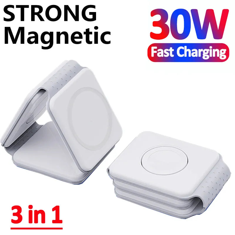 Le chargeur magnรฉtique sans fil pliable 3 en 1 offre une solution pratique et polyvalente pour les utilisateurs d'Apple. Compatible avec iPhone, MacSafe, Apple Watch, et AirPods, il assure une charge rapide avec une puissance de 30W. Sa conception pliable le rend portable, parfait pour une utilisation nomade. Idรฉal pour les modรจles 14, 13, 12 Pro Max, ce chargeur simplifie la gestion des appareils Apple, offrant une solution efficace et รฉlรฉgante.