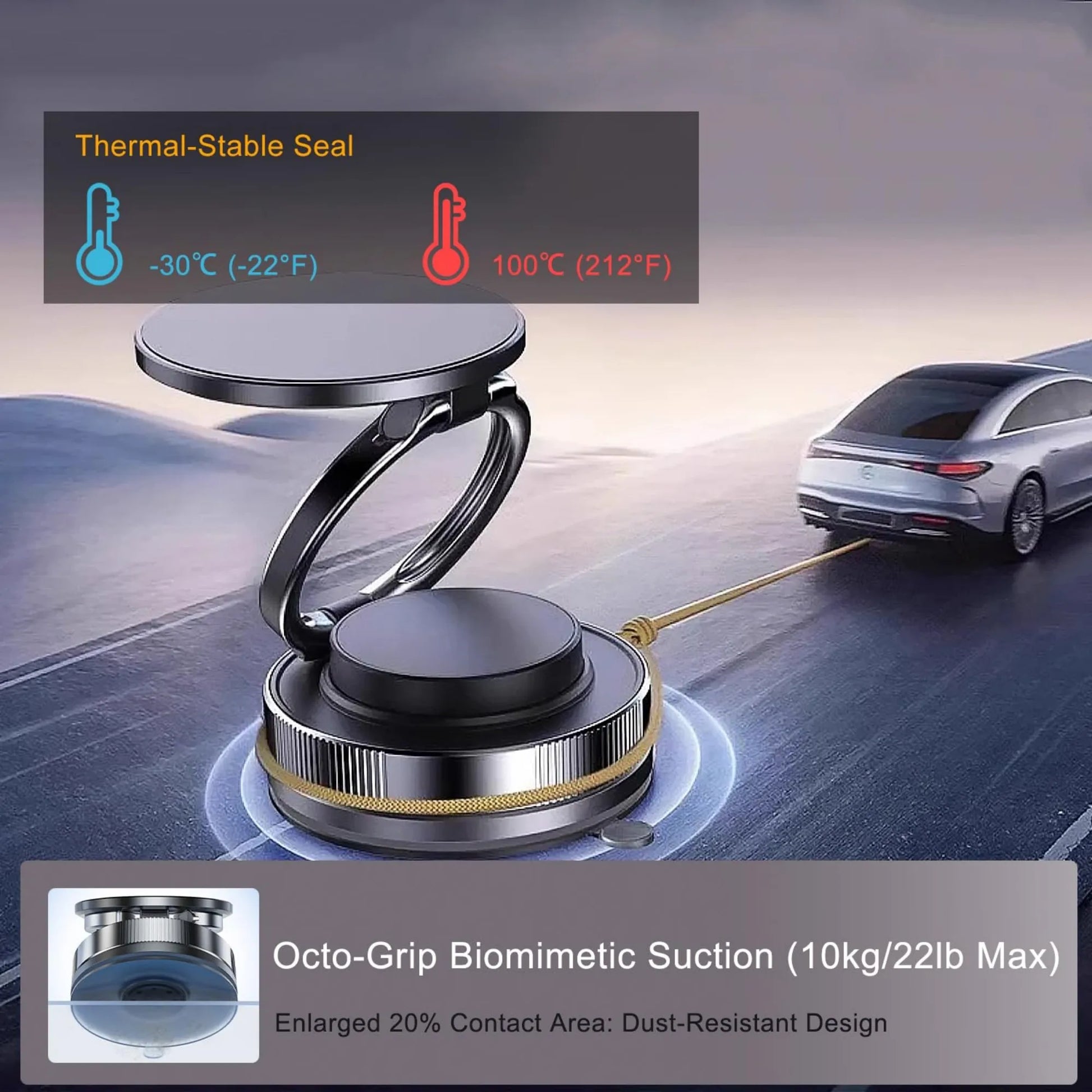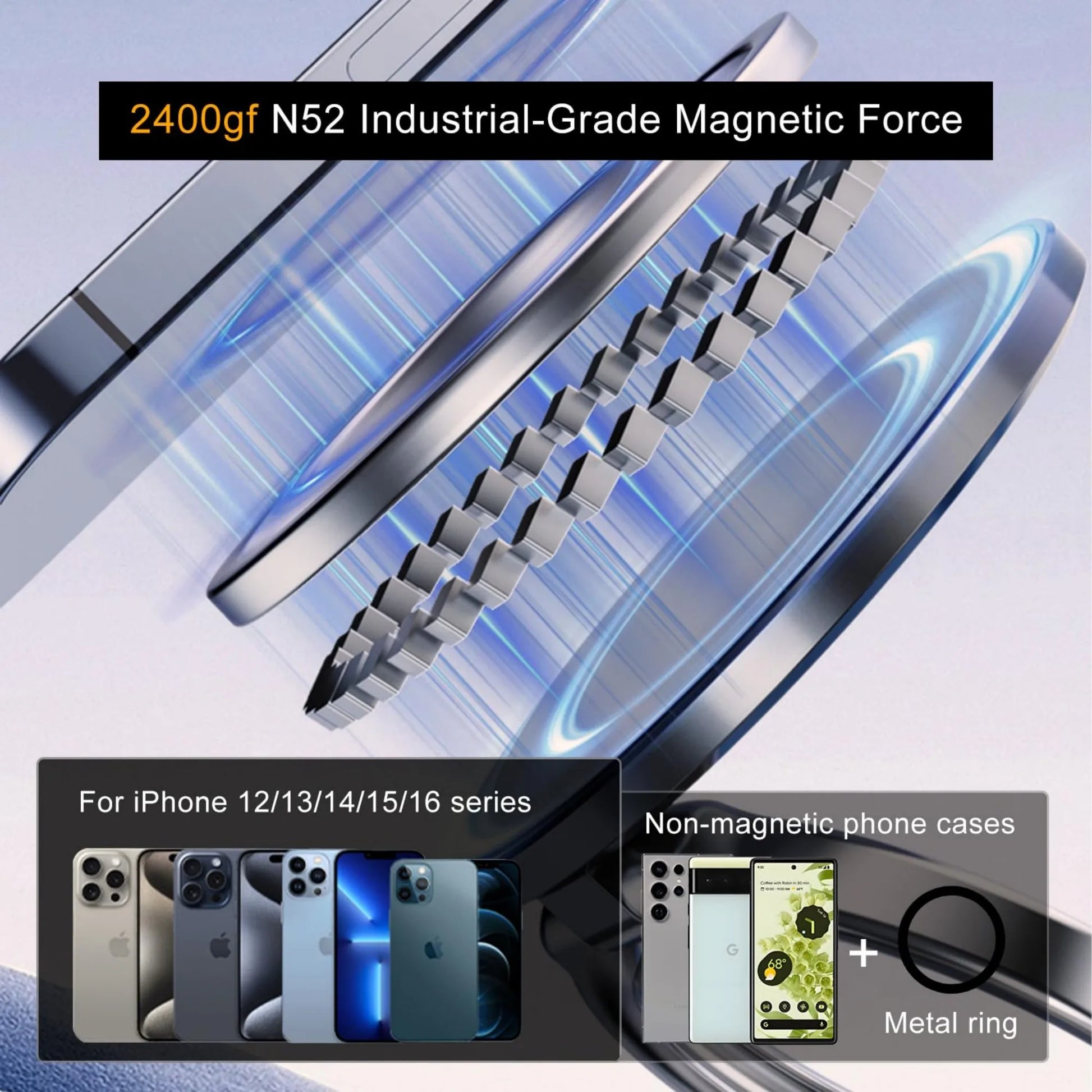 Force magnรฉtique puissanteย : รฉquipรฉ de 20ย ย aimants en nรฉodyme de qualitรฉ NS2ย ย disposรฉs en double anneau, garantissant que votre tรฉlรฉphone reste en place mรชme sous les vibrations !